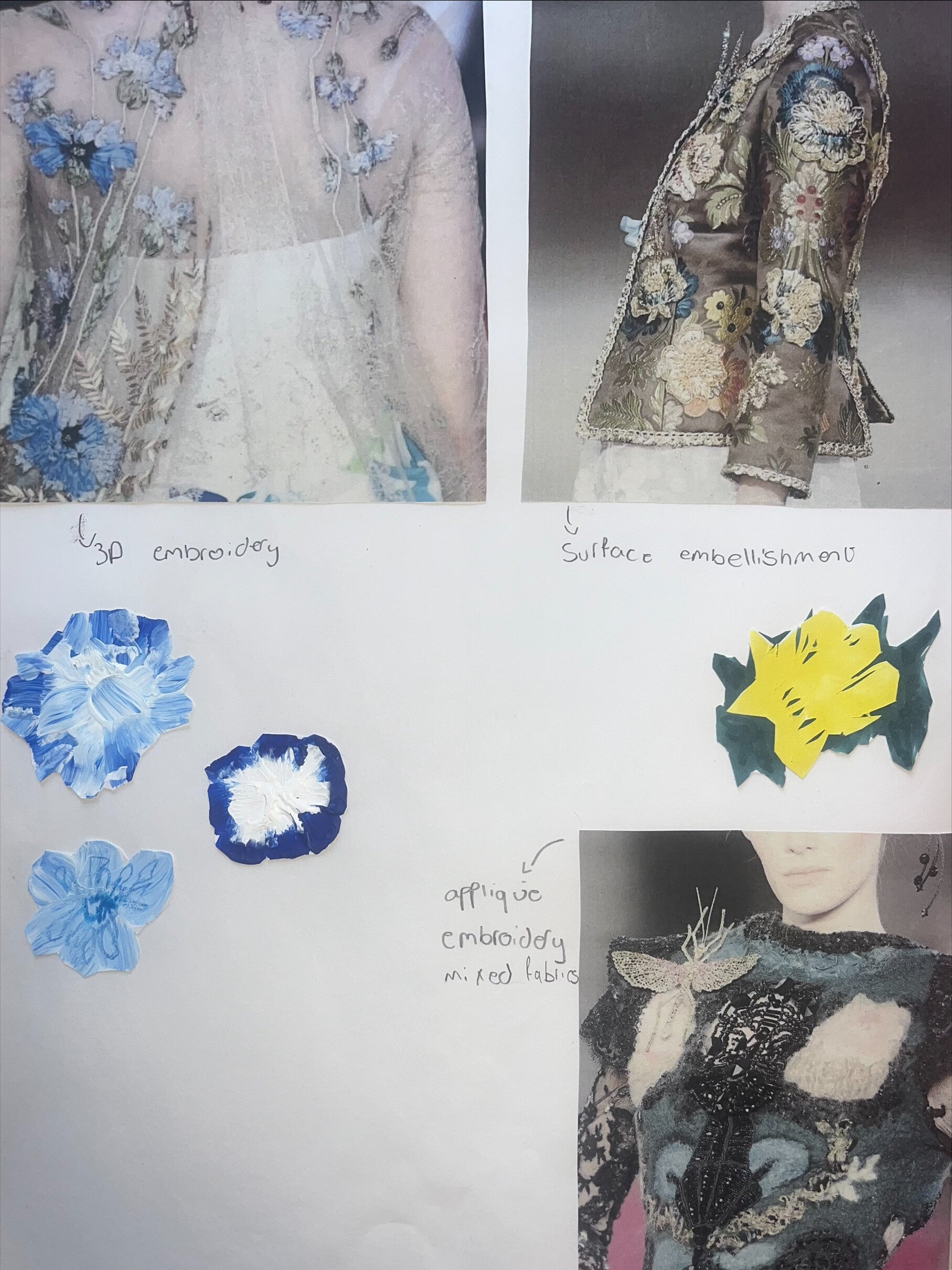I always start my design work by collecting images, references and ideas that catch my eye. From there, I sketch, test shapes and play around with different silhouettes to see what feels right for the project.